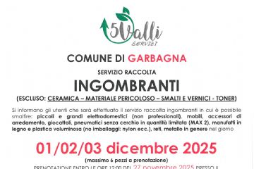 5Valli servizi e Comune di Garbagna organizzano per le giornate del 1, 2 e 3 dicembre p.v. una raccolta porta a porta di materiali ingombranti; Prenotazione obbligatoria entro il 27 novembre al n....