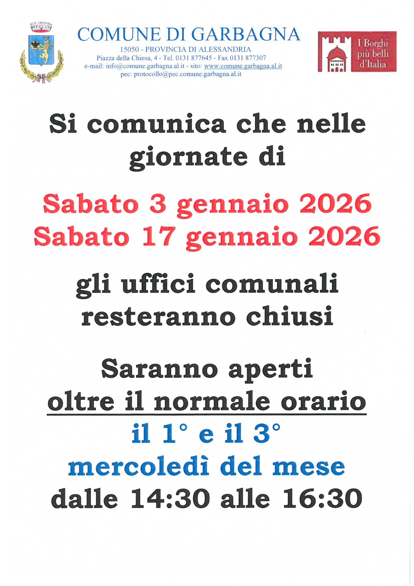 Chiusura 1° e 3° sabato del mese di gennaio 2026