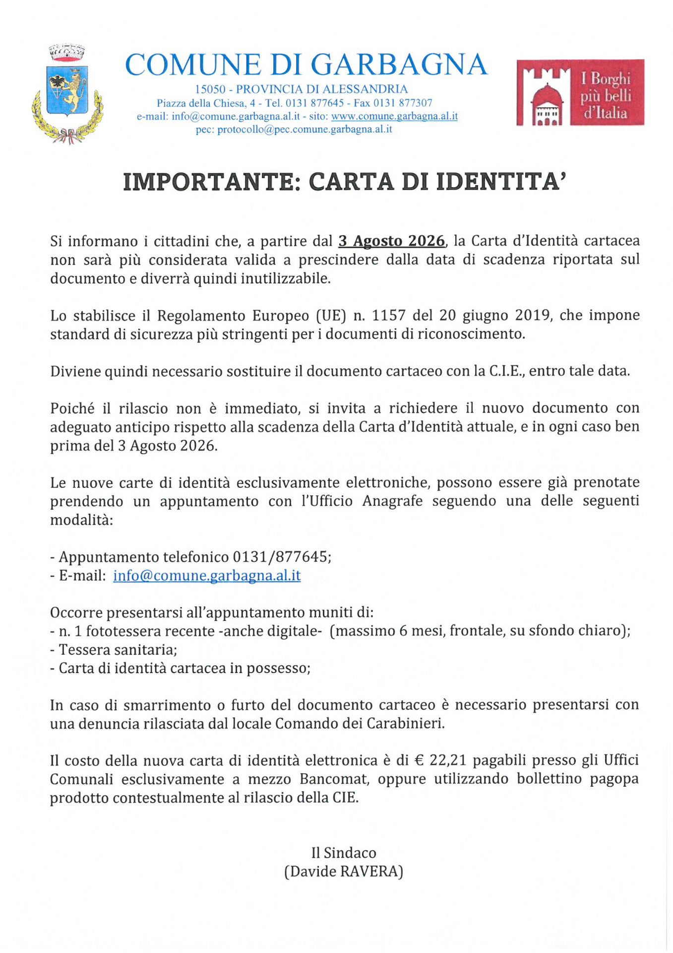 Si informano i cittadini che, a partire dal 3 Agosto 2026, la Carta d’Identità cartacea non sarà più considerata valida a prescindere dalla data di scadenza riportata sul documento e diverrà quindi inutilizzabile.