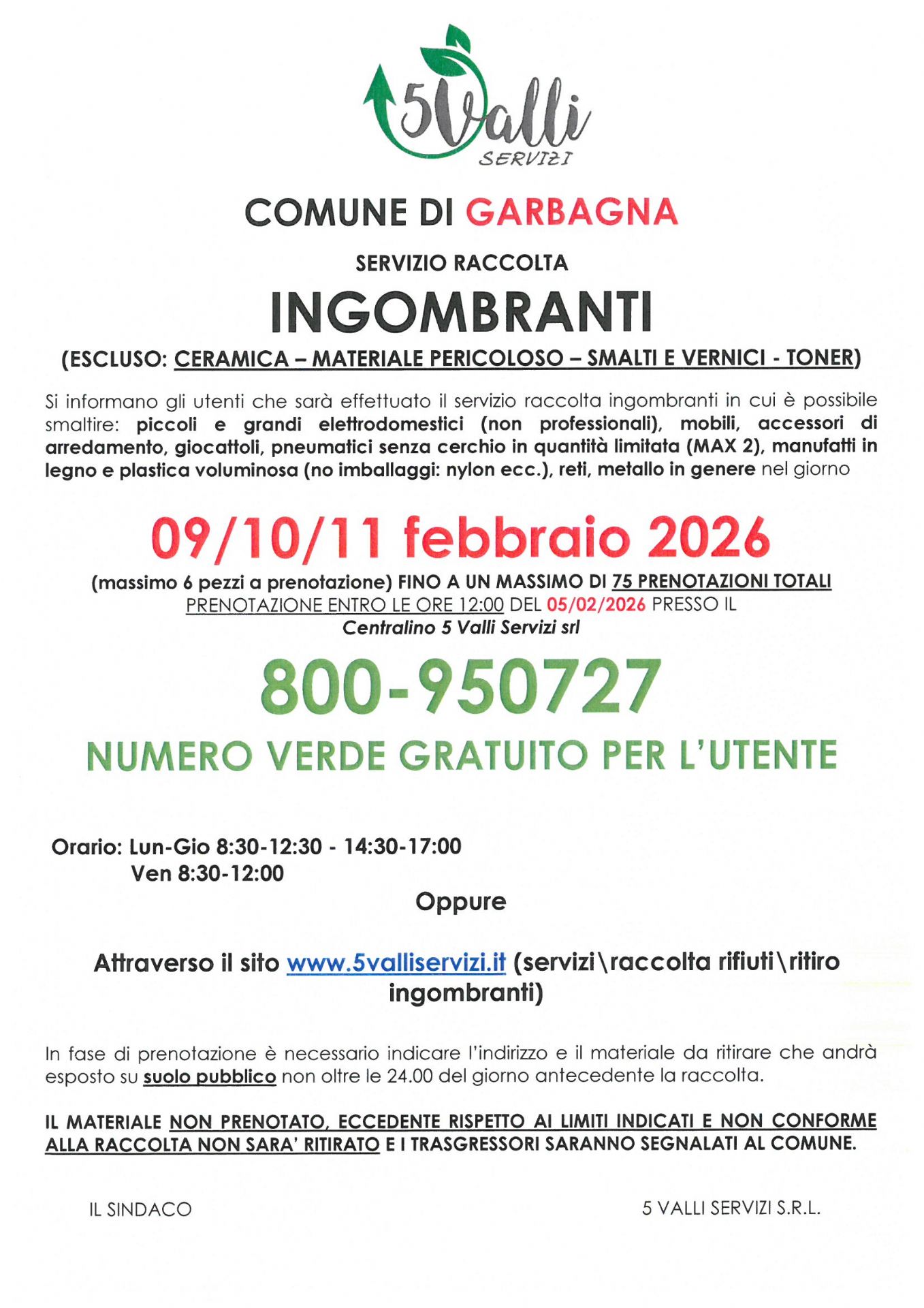 Comune di Garbagna e 5Valli servizi organizzano una raccolta di materiale ingombrante nelle giornate del 9/10/11 febbraio 2026.