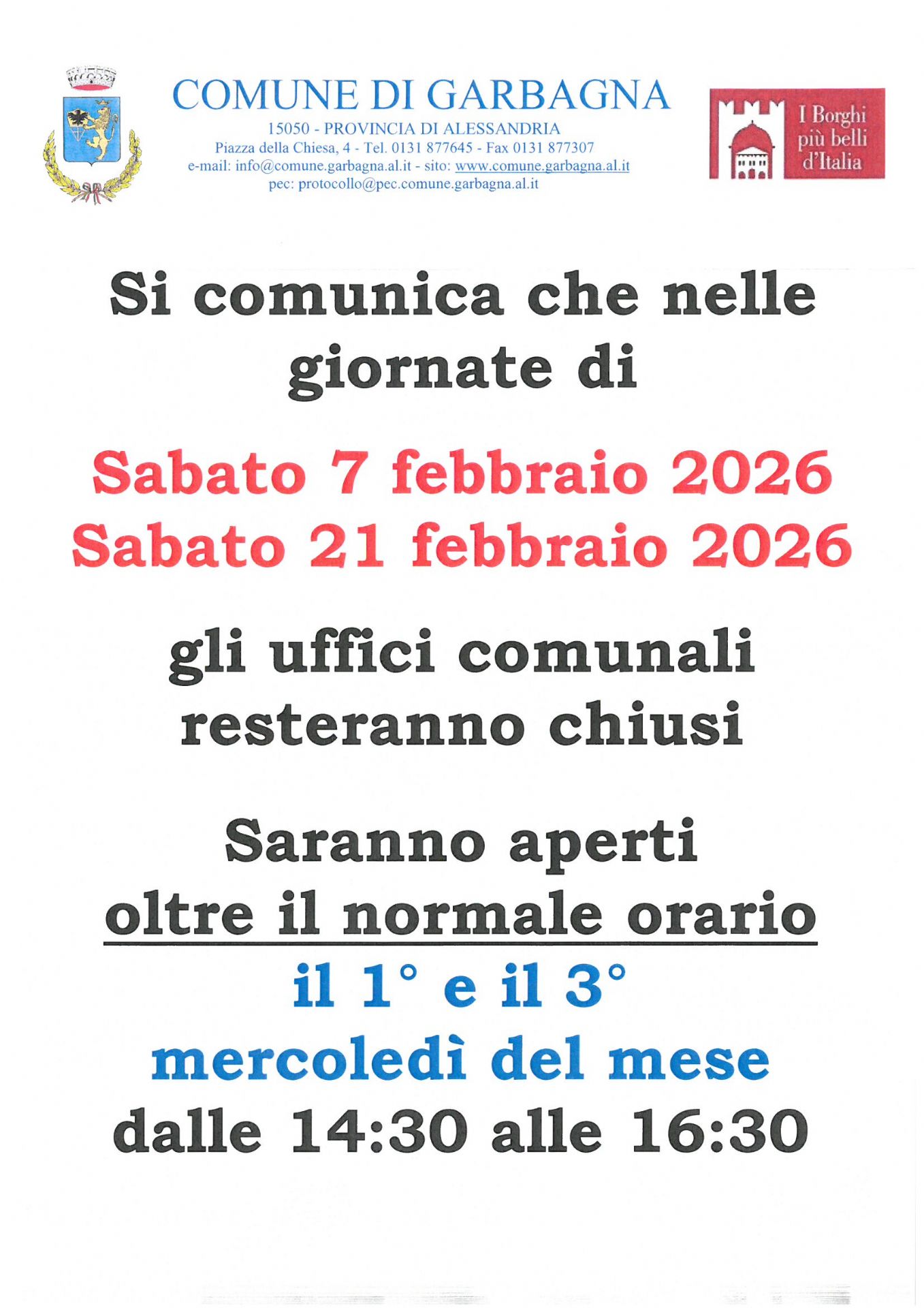 Chiusura sabati mese di febbraio