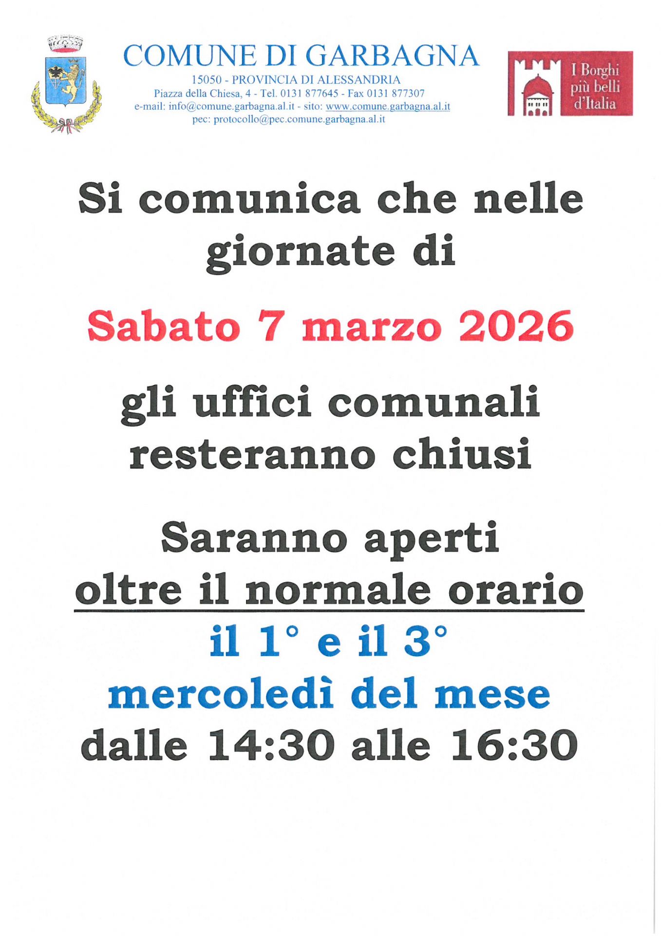 Chiusura uffici sabato 7 del mese di marzo