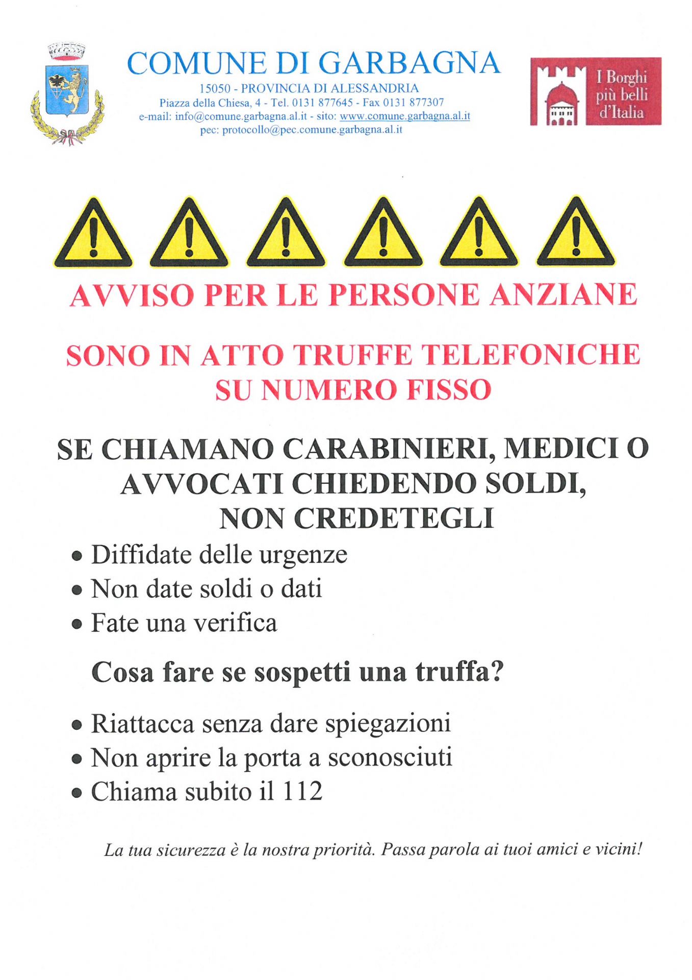 Avviso alle persone anziane. Attenzione sono in atto truffe telefoniche su numero fisso.