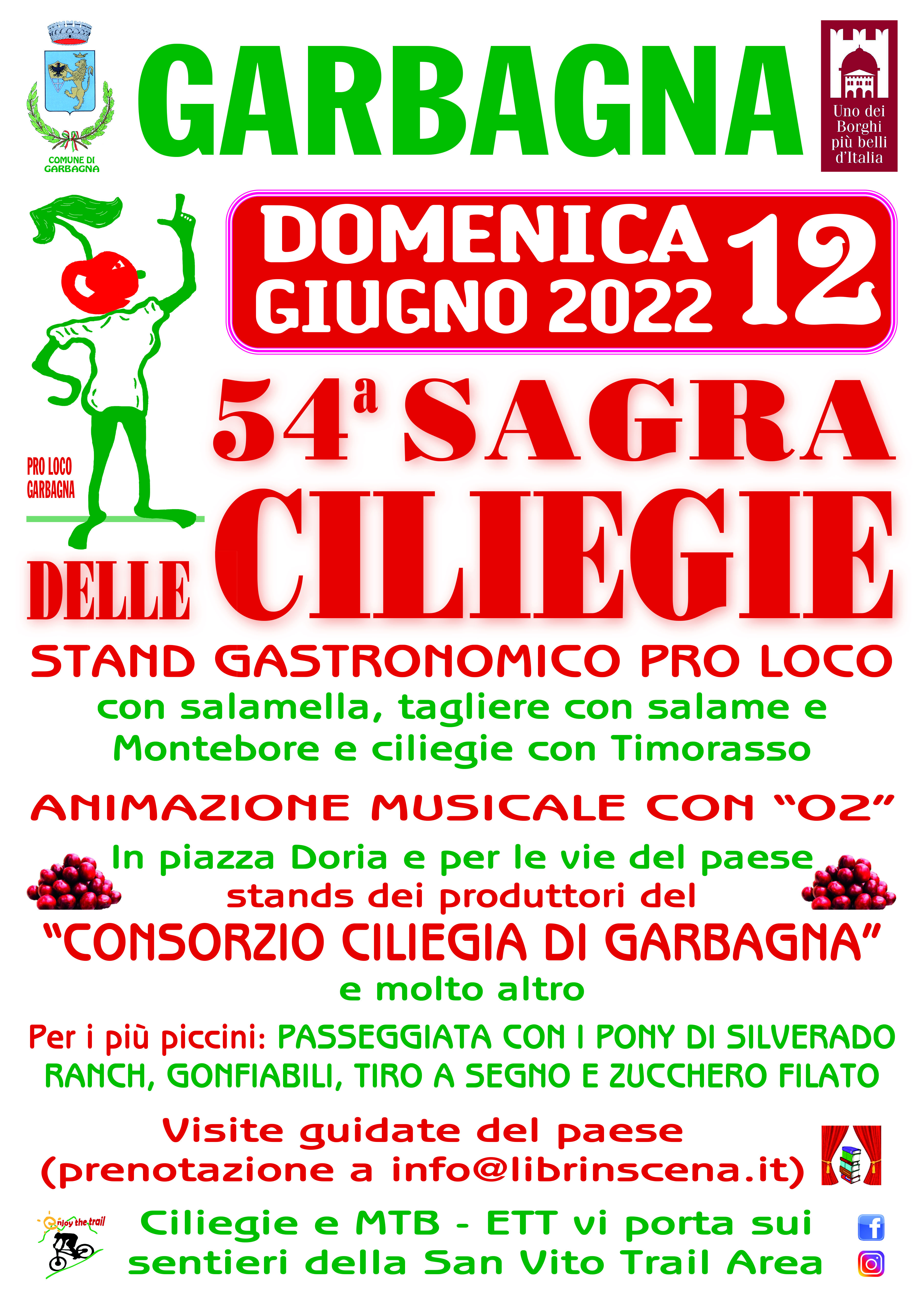 Torna dopo due anni di assenza l'abituale Sagra delle Ciliegie giunta alla 54° edizione. Nella cornice di uno dei Borghi più belli d'Italia la Ciliegia di Garbagna diventa Regina. A farle da contorno stand gastronomici, animazione musicale, intrattenimento per i più piccini, hobbisti e commercianti. Possibilità di visite guidate del Borgo ed escursioni ciclistiche.