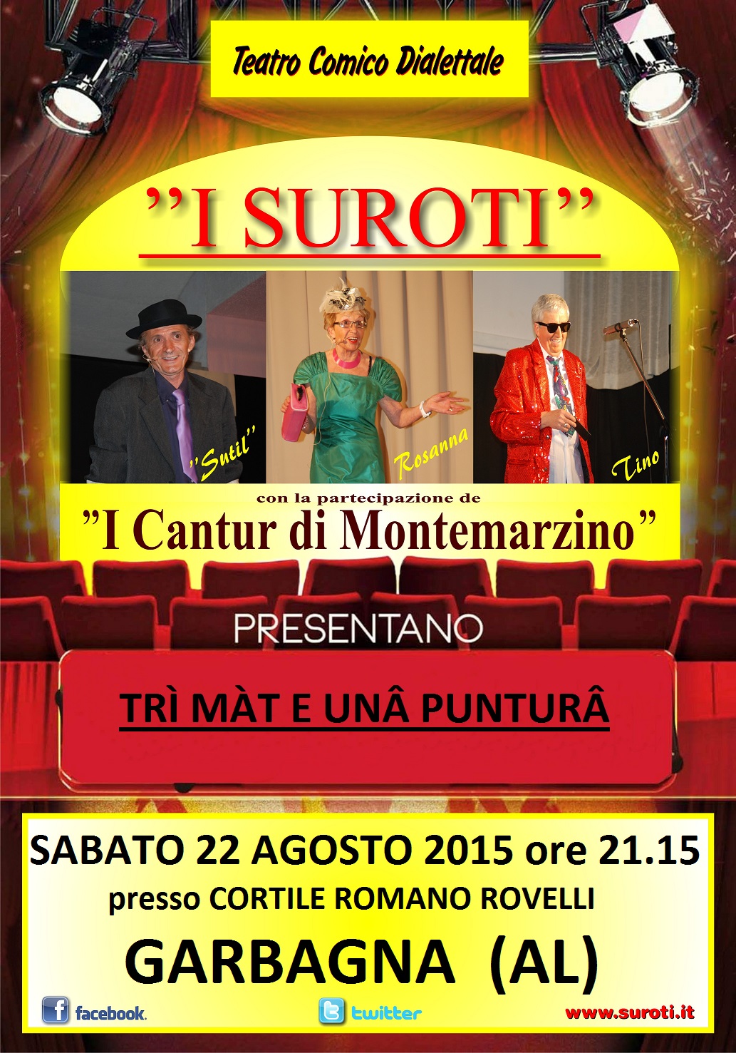SABATO 22 AGOSTO 2015 alle ore 21.15, presso il cortile Romano Rovelli di Garbagna, I SUROTI con I CANTUR DI MONTEMARZINO presentano la commedia comico dialettale "TRI MAT E UNA PUNTURA"