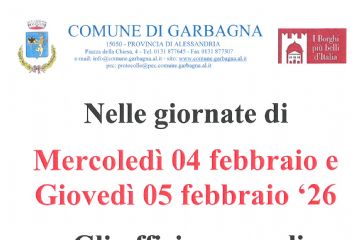 A causa di aggiornamenti del gestionale non si garantiscono i normali servizi del Comune di Garbagna nelle giornate di mercoledì 3 e giovedì 4...