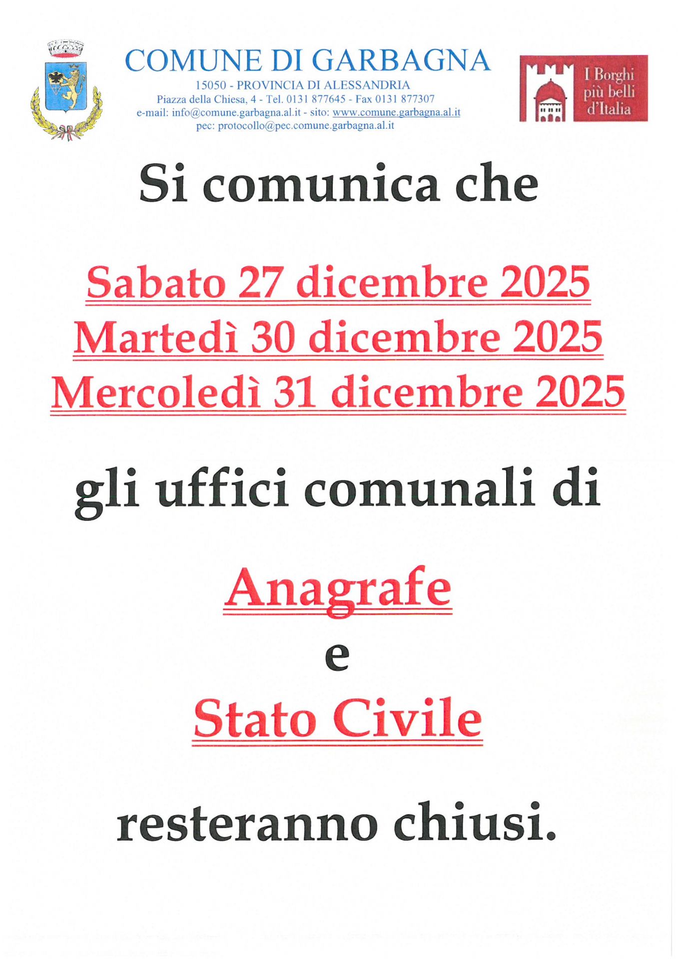 Chiusura uffici Anagrafe e Stato Civile nelle giornate del 27 - 30 - 31 dicembre 2025