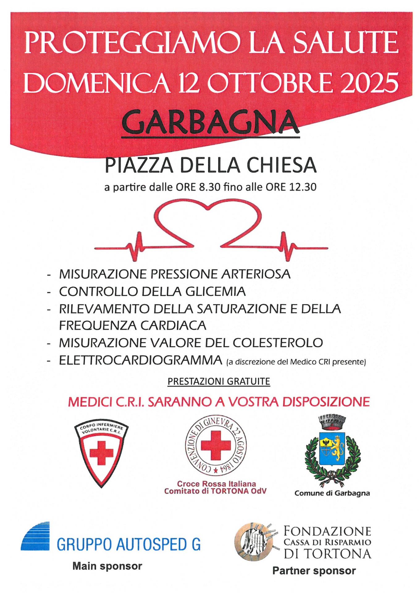 Medici della Croce Rossa Italiana - comitato di Tortona-, affiancati da infermieri volontari effettueranno nella giornata di domenica 12 ottobre 2025 uno screening gratuito rivolto alla popolazione; l'unità mobile sarà presente in Piazza della Chiesa dalle 08:30 alle 12:30 per una serie di esami diagnostici (maggiori info nella locandina allegata).