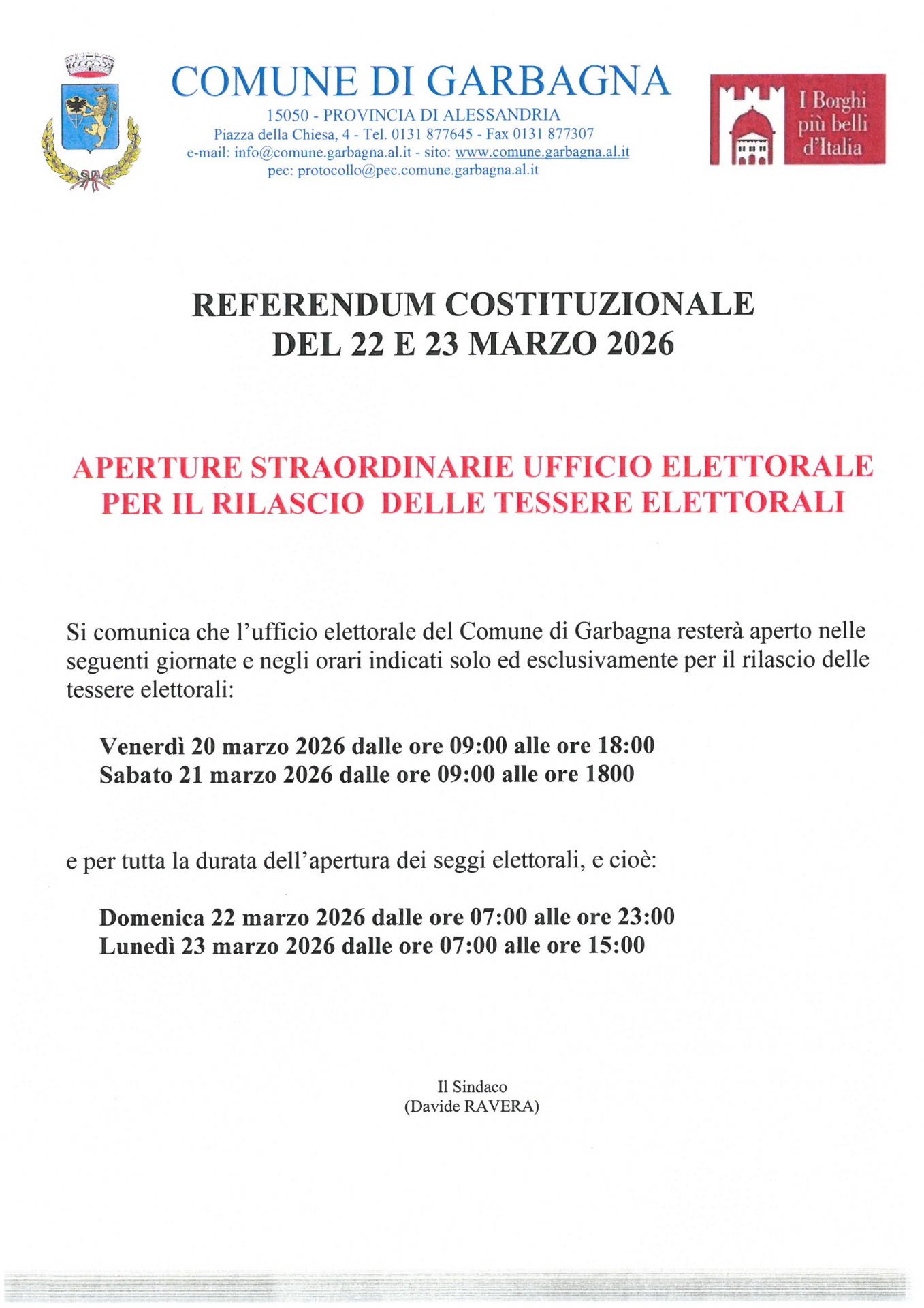 In occasioni delle consultazioni referendarie del 22 e 23 marzo 2026, gli uffici comunali elettorali effettueranno un'apertura straordinaria per il solo rilascio delle tessere elettorali negli orari indicati in allegato