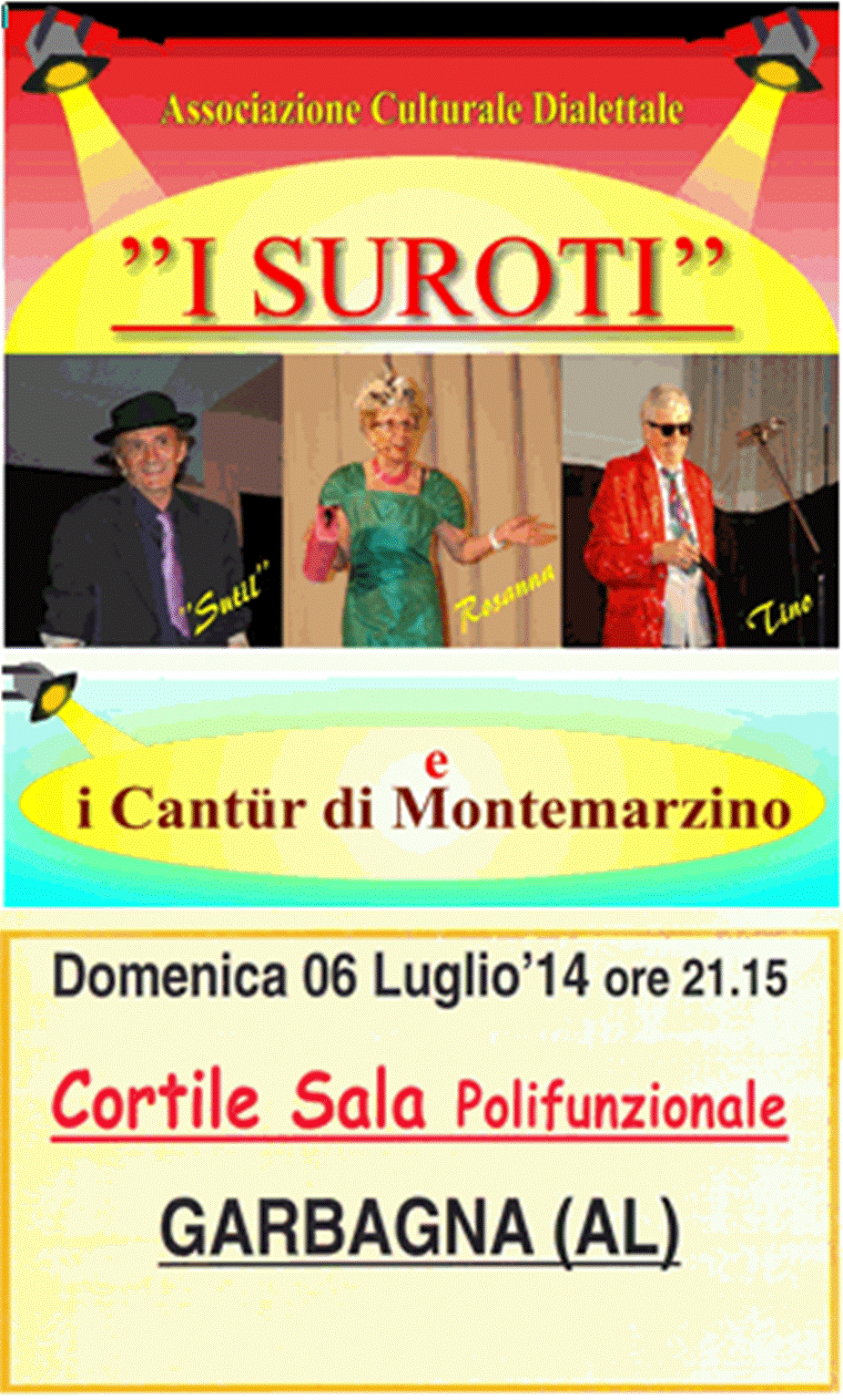 Serata di teatro presso il cortile della sala polifunzionale di Garbagna in Piazza Principe Doria. DOMENICA 6 LUGLIO 2014 alle ore 21,15 con i SUROTI e I CANTUR di MONTEMARZINO.