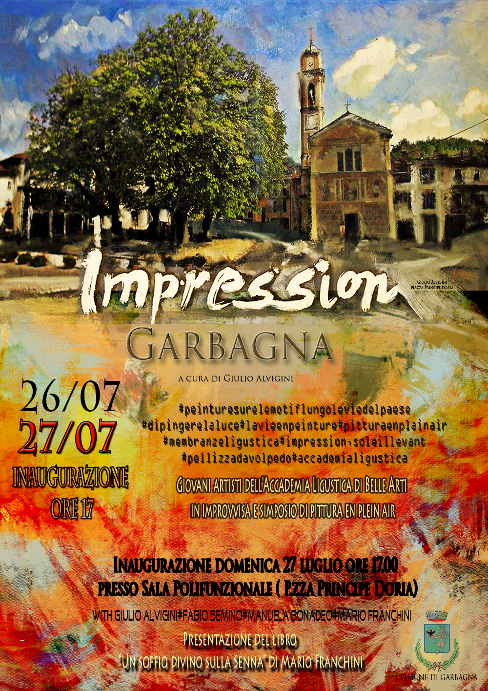 Sabato 26 luglio, per le vie del paese, una decina di giovani pittori dell'Accademia Ligustica di Genova allieteranno il pomeriggio dipingendo "en plain air" caratteristici scorci del paese, organizzazione a cura di Giulio Alvigini.