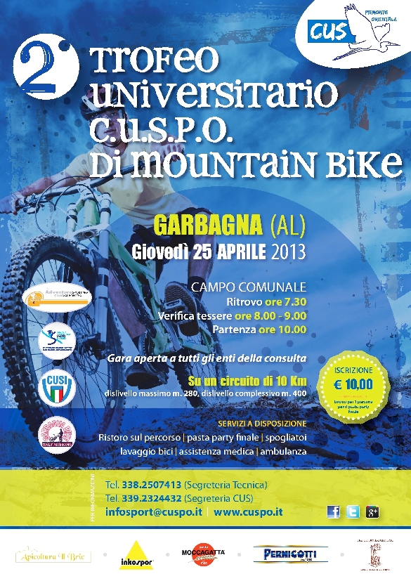 A Garbagna Giovedì 25 aprile 2013 si terrà una gara di Mountain Bike organizzata dal CUS Piemonte Orientale, il ritrovo avverrà presso il Campo Sportivo Comunale dalle ore 07,30 e la partenza è prevista per le ore 10,00.