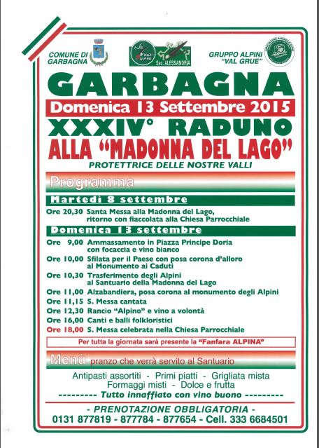 IL Gruppo Alpini "VAL GRUE" di Garbagna organizza l'annuale raduno al Santuario della Madonna del Lago. Per informazioni e prenotazioni vedere locandina allegata.